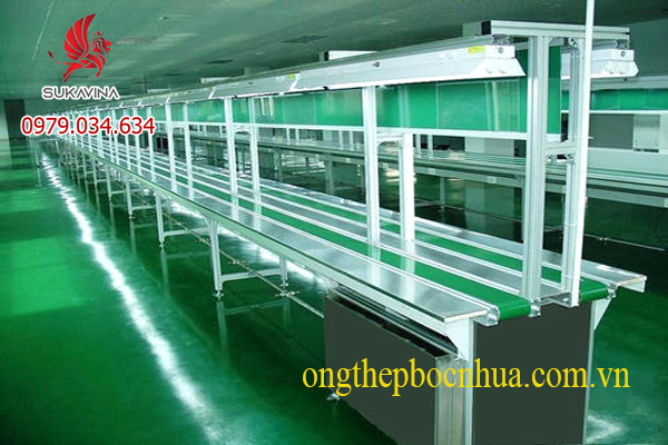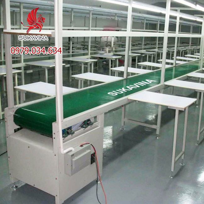 Băng chuyền PVC kết hợp bàn thao tác giúp quá trình thao tác trở nên dễ dàng, ít di chuyển từ đó nâng cao năng suất lao động.
