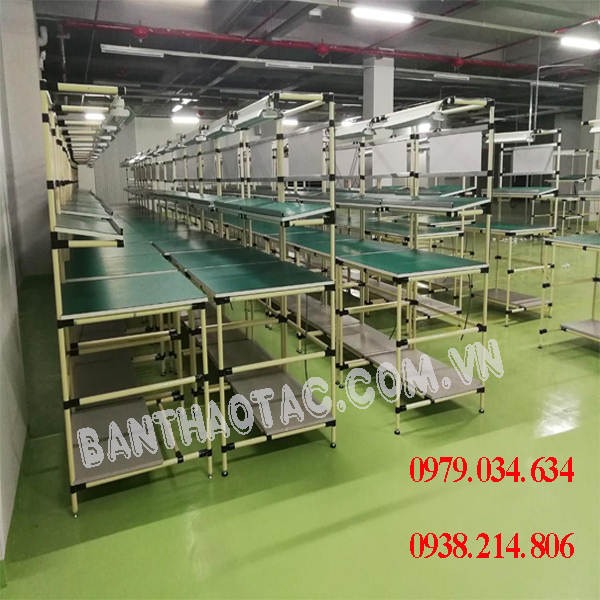 Bàn thao tác lắp ráp với những tính năng linh hoạt, dễ dàng tháo lắp và di chuyển. Bàn thao tác lắp ráp được sử dụng rộng rãi trong nhà máy, xí nghiệp.