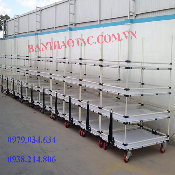 • Xe đẩy hàng kết hợp với mặt bàn thao tác, giúp công nhân có thể thao tác làm việc trên mặt bàn một cách dễ dàng.